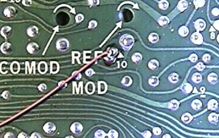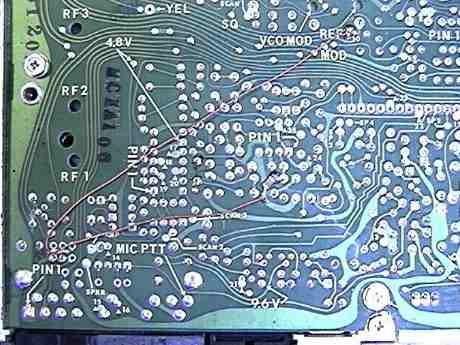 The receiver audio is obtained from the TOP OF VOLUME CONTROL, or TVC test point. The older MCX boards didnt have a TVC silkscreened onto the board, so you have solder your wire here. This closeup shows just where a piece of small wire ( red #30 wire wrap wire in this view) is soldered into the plate thru hole on the main board next to the triangle with a 10 next to it. The receive audio at this point is constant, and is squelched audio. This wire runs down towards the rear of the radio, to a cut jumper that leads to the 7 position options plug.