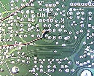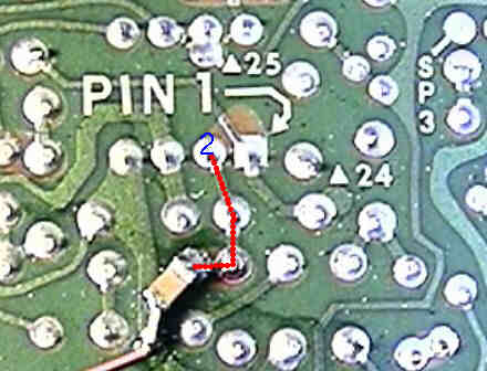This view shows two jumpers that are cut (JU351 and JU352), and the wires that solder into the holes that go directly to the external pins. The receive audio is present on pin 1, the transmit audio is on pin 2. The pins count in a staggered arrangement from left to right. See my page on trackers using KPC3's for information on setting the jumpers to power the TNC from the DB9 port.