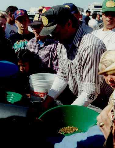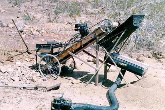 of gold. As dirt and clods are fed into the square hopper in the back, the